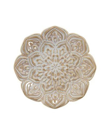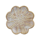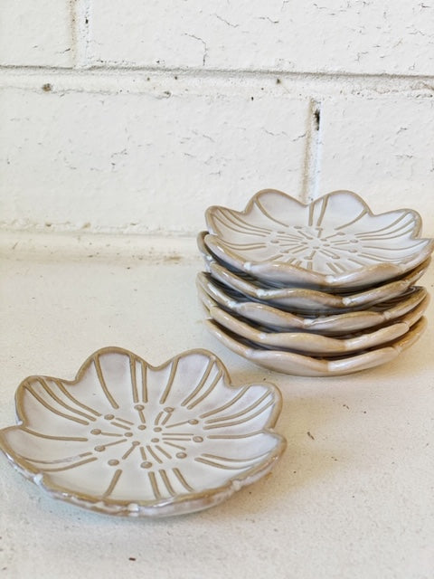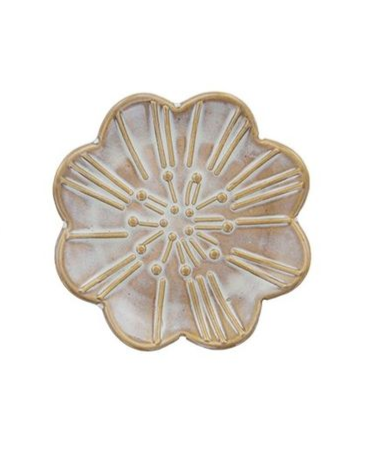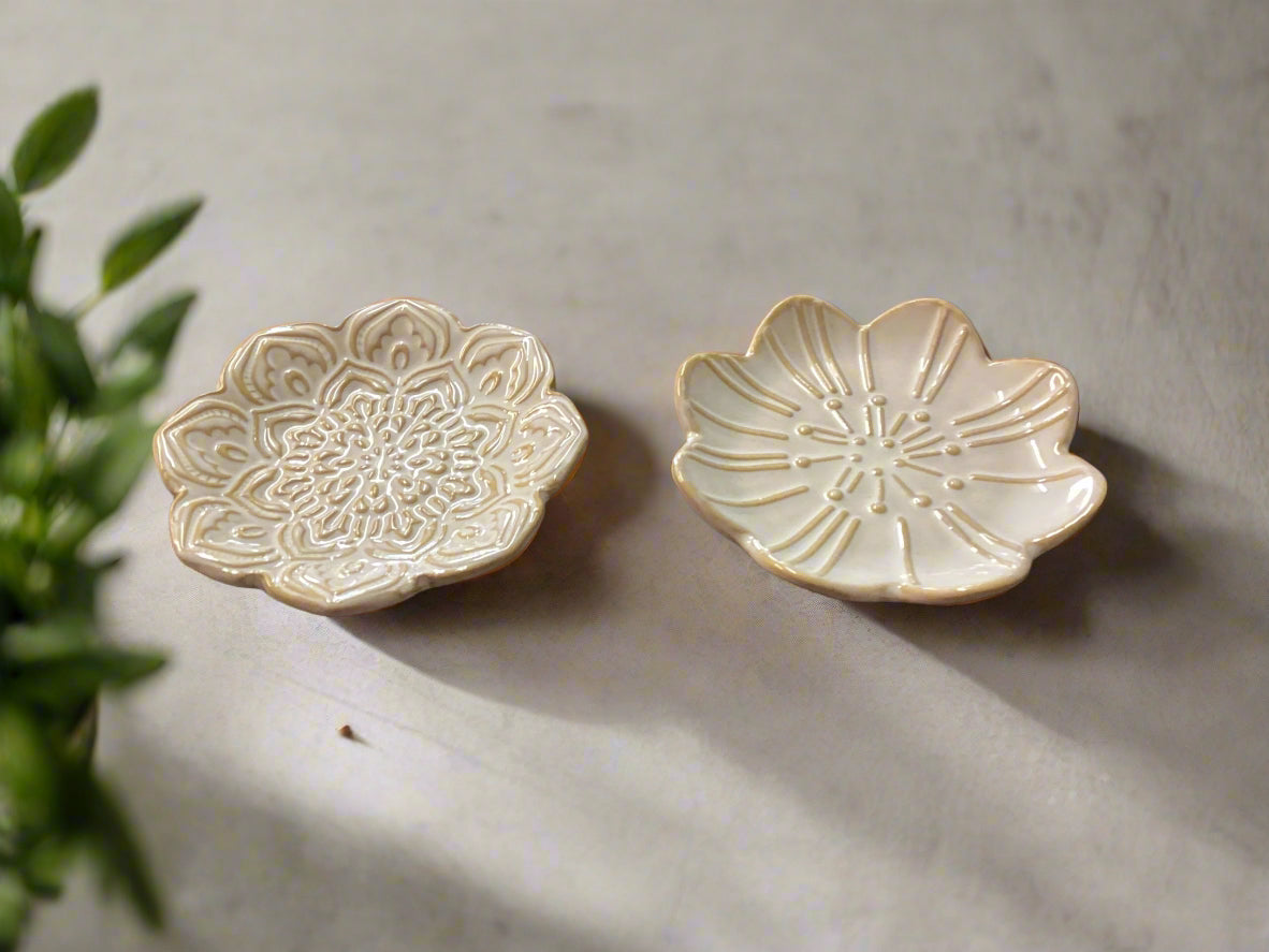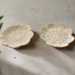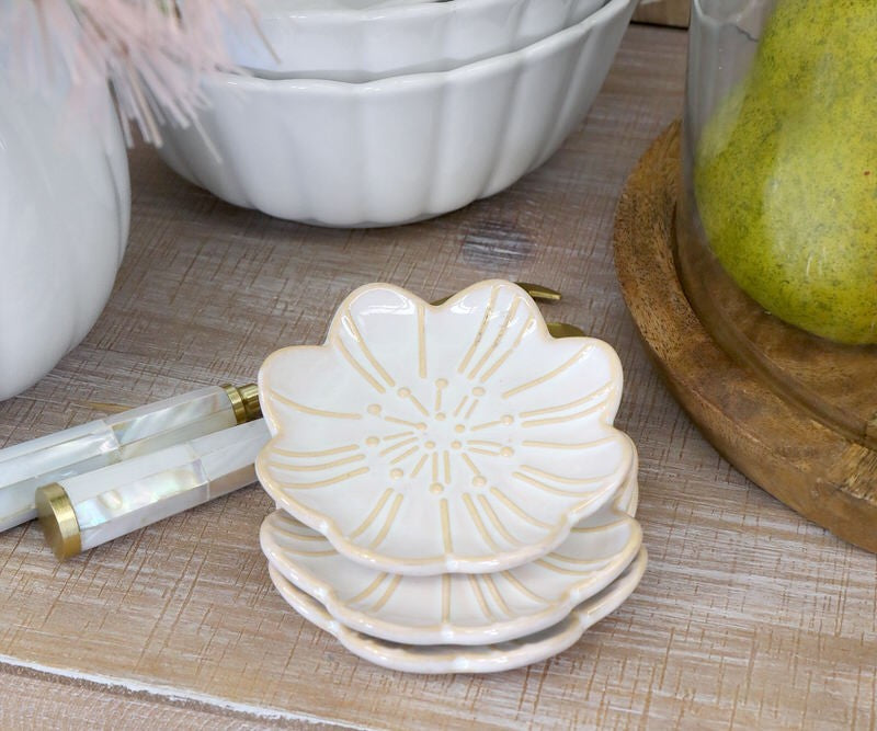 The Indira Trinket Bowl is shaped like a blooming flower, with delicate petal detailing highlighted by a soft glaze and gold edging. Perfectly sized for jewellery, keys or small treasures, it doubles as a decorative accent when styled on a bedside table or console.
