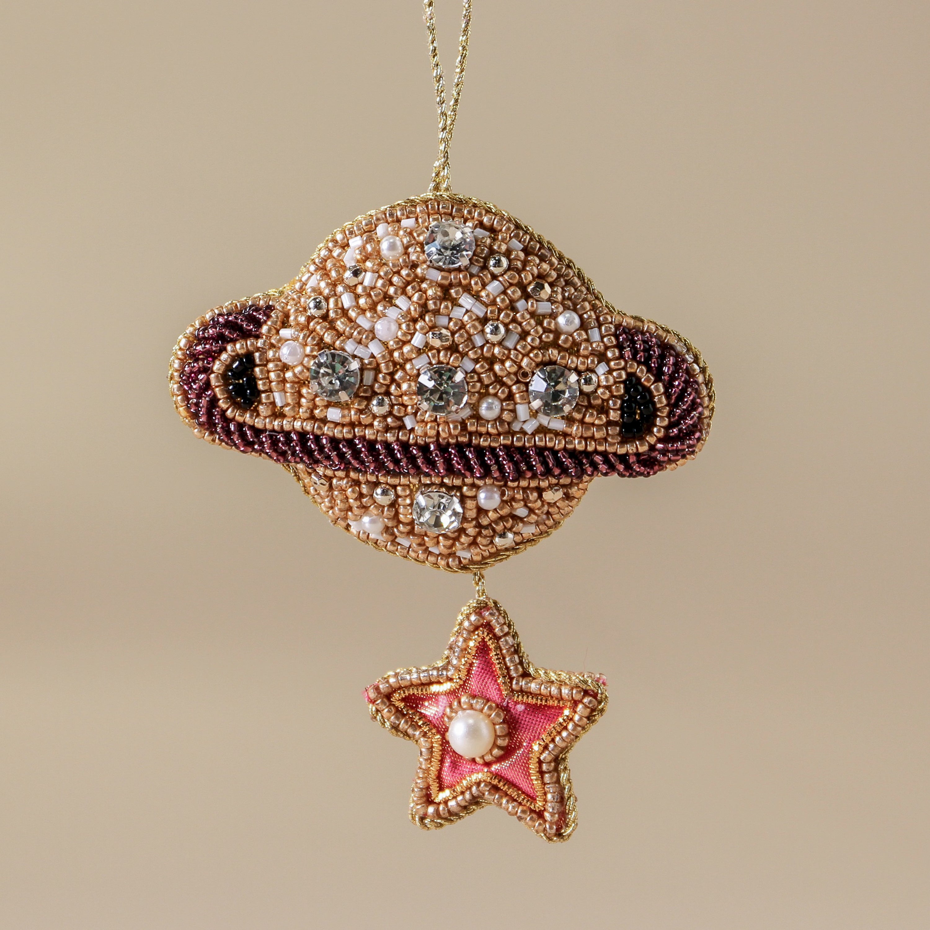 Journey through the stars with this magical Saturn ornament. Golden beads capture the planet's radiance, while its signature ring and delicate dangling star add celestial charm. A whimsical blend of science and storybook wonder, it's perfect for those who gaze upward and dream big.