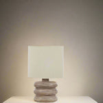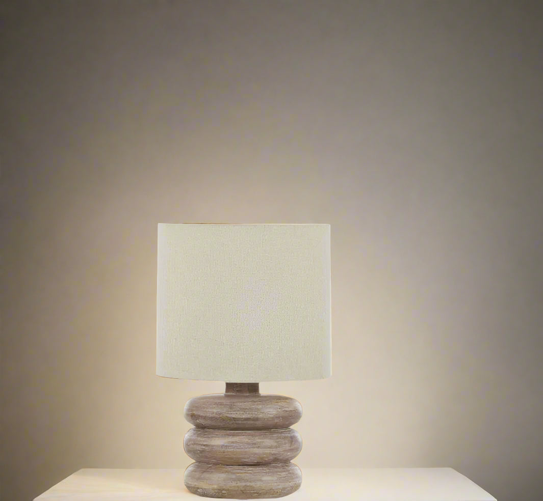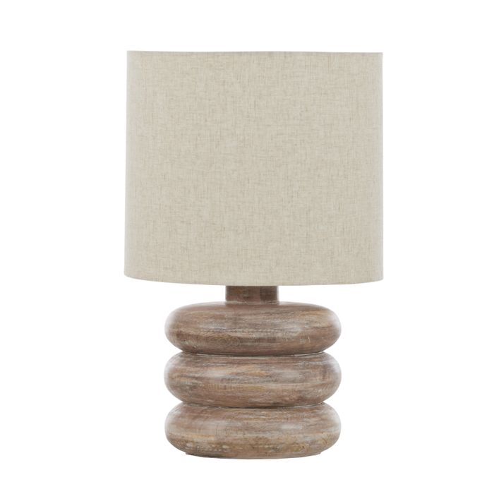 • A sturdy wooden base and a soft linen beige shade