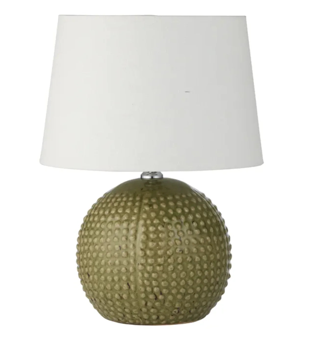 • Green ceramic table lamp with a bobbled finish.