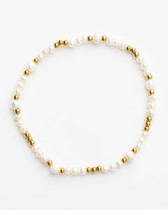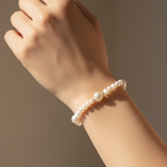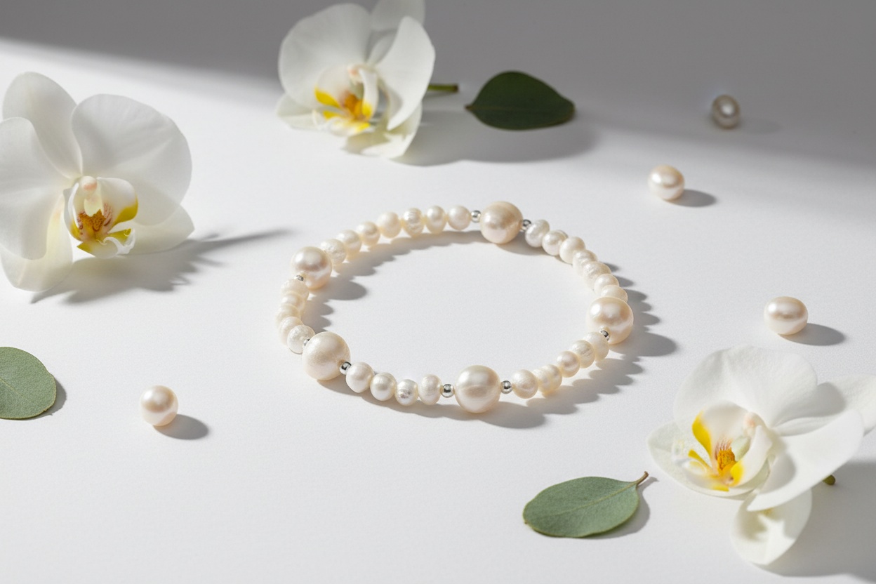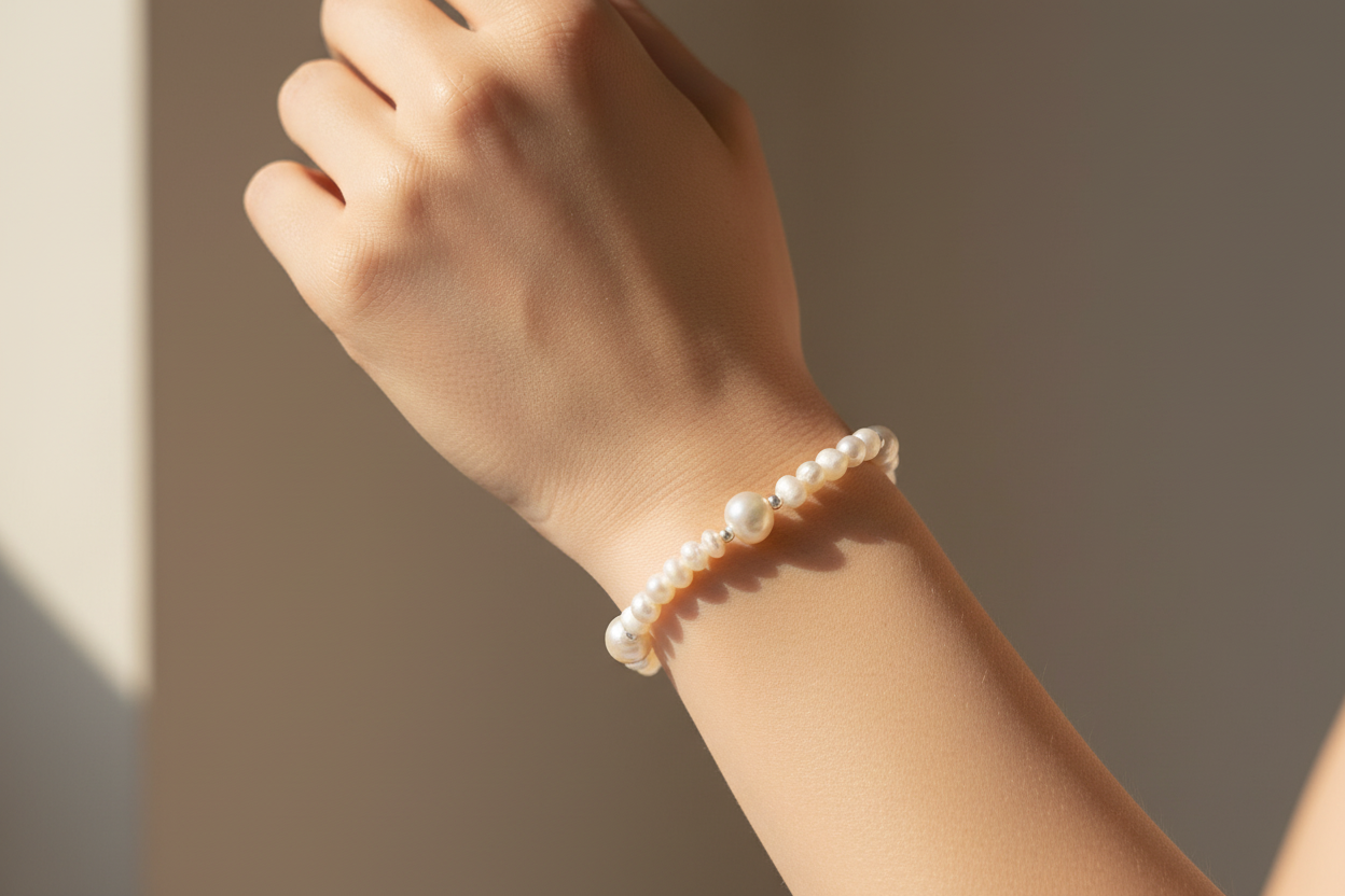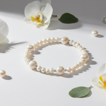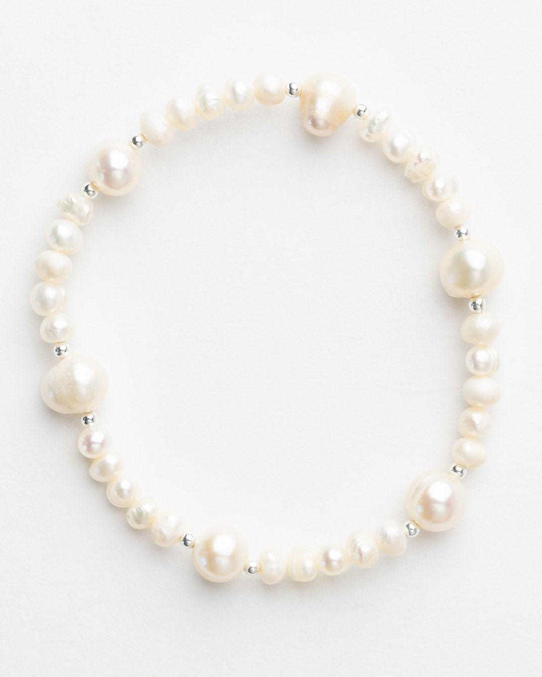 Freshwater pearl bracelet with polished silver accents that catches the light beautifully. Each piece is one-of-a-kind, strung with care to move gracefully with you throughout your day.