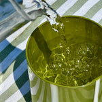 It is a vibrant, striped tumbler featuring bold white stripes on a olive base, designed for a playful, Mediterranean-inspired aesthetic. This cylindrical glass brings a stylish,, maximalist touch to table settings, suitable for water, juices, or cocktails.