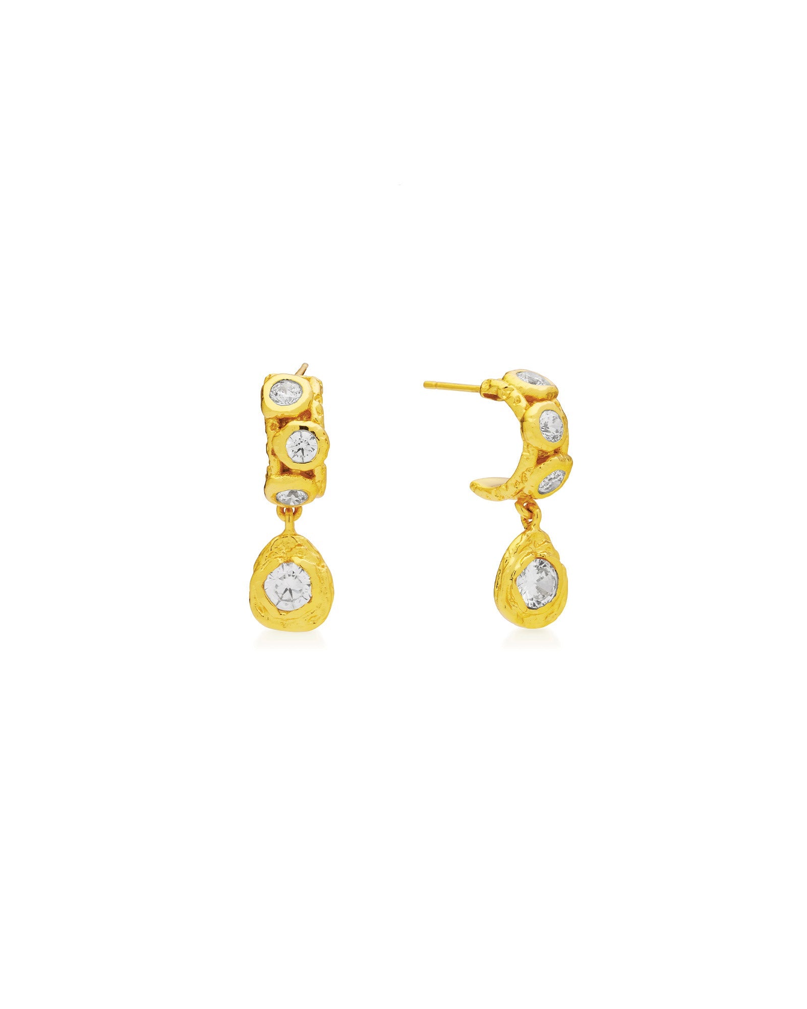 A contemporary take on a classis hoop, the Alanya Earrings are adorned with cubic zirconia crystals encased in crushed 24K gold plating.