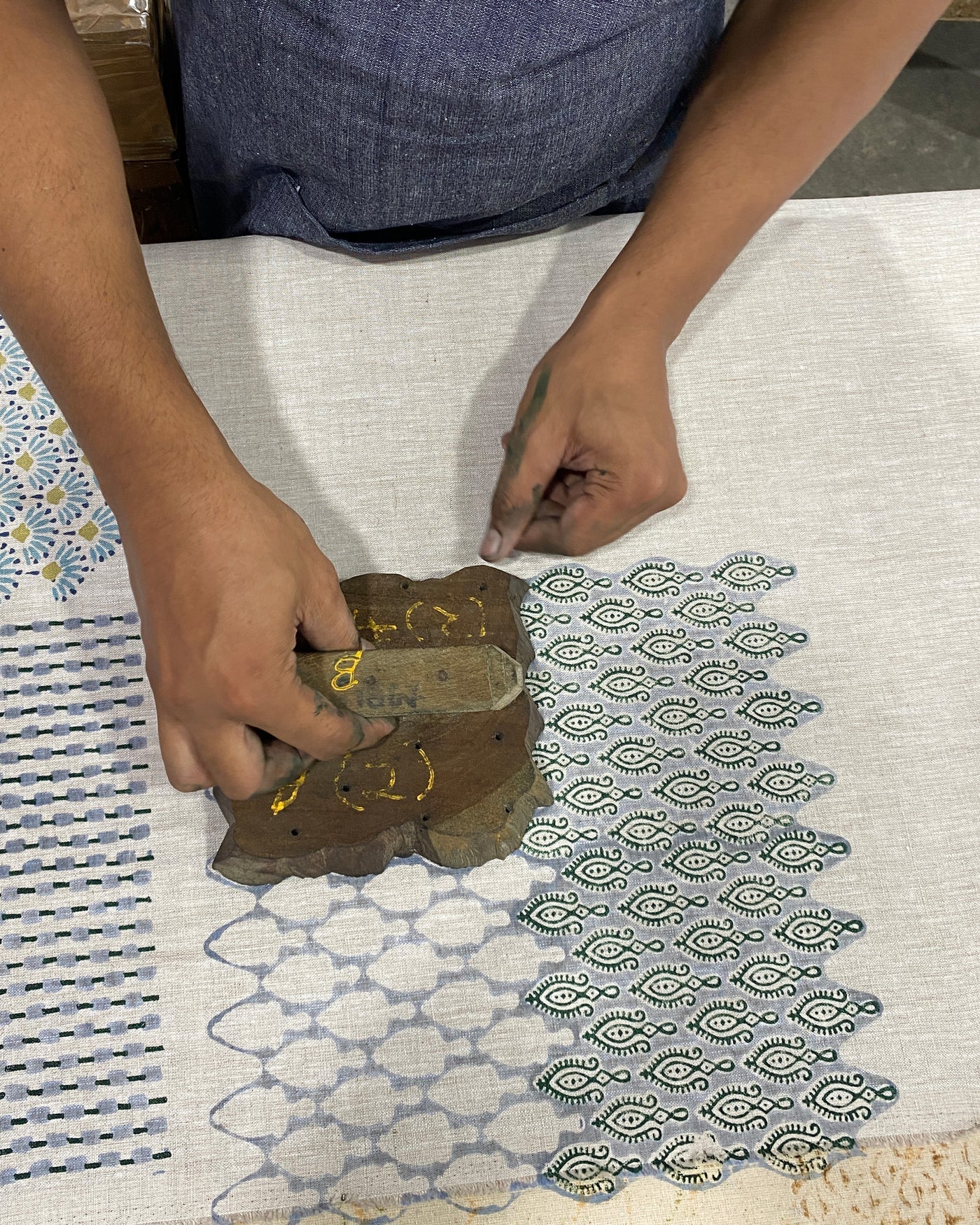 Cold machine wash separately on a delicate cycle with a very minimal amount of mild liquid detergent. Do not dry clean, tumble dry, soak or bleach. Iron at medium setting if necessary. For spot cleaning, gently dab the area with water (do not rub). Keep out of direct sunlight to avoid excessive fading. Due to the nature of hand printed fabrics, variation in colour and pattern may occur.