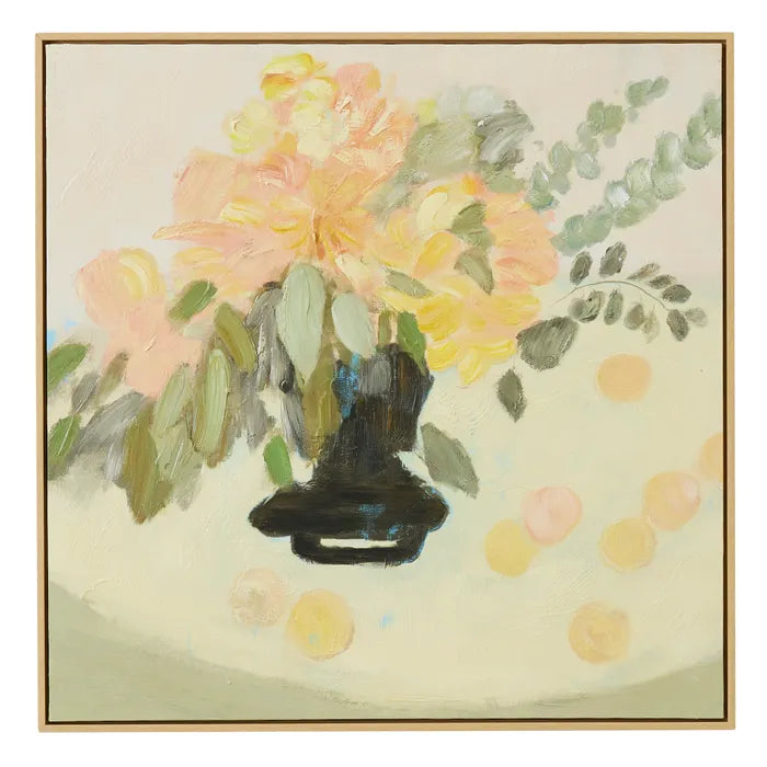 This printed canvas and textured oil painting captures soft florals in a loose, expressive style. With gentle brushstrokes and a natural palette, it brings a light charm to your space.