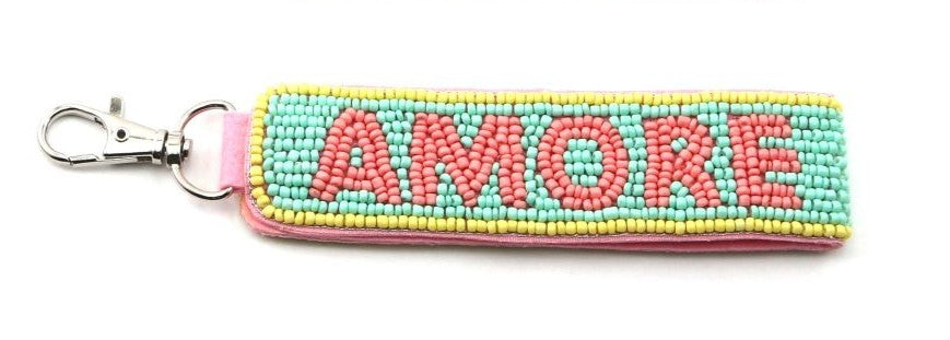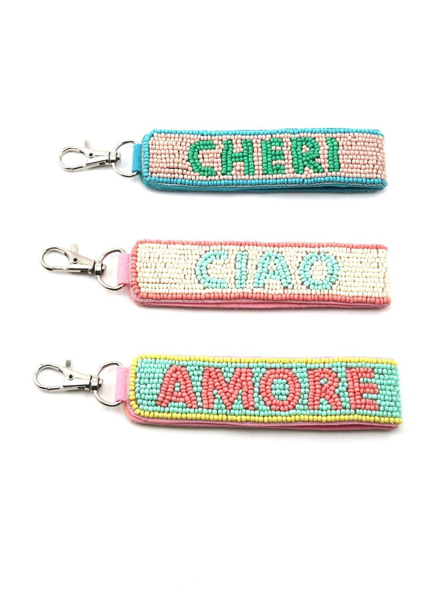 These colorful beaded keyrings are charming, personalized accessories that add a vibrant touch to everyday essentials. Each piece is carefully handcrafted with tightly woven beads, offering a durable, textured finish. Featuring bold custom words like “CHERI,” “CIAO,” and “AMORE,” they make thoughtful gifts and unique keepsakes.