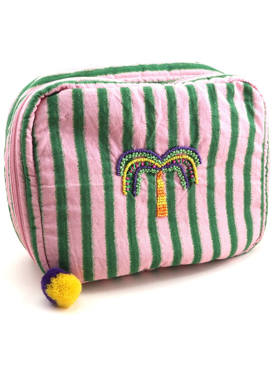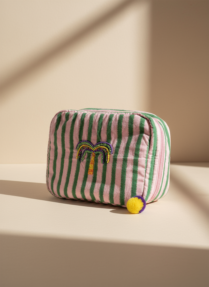 The elegant gold-tone zip closure is adorned with a palm tree charm, adding a relaxed, sun-kissed allure. Whether placed inside a larger bag or carried alone for quick trips, this pouch offers a charming and functional addition for anyone seeking a subtle yet distinctive personality boost in their accessories.