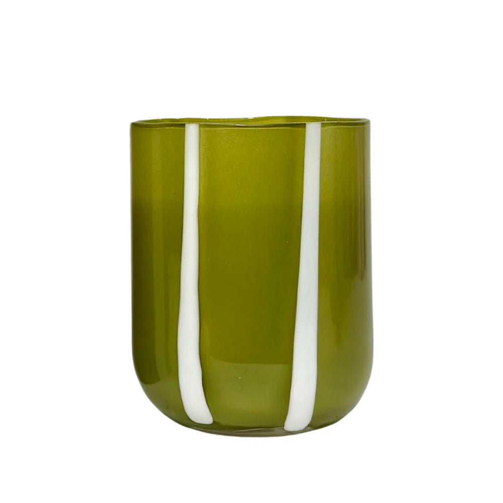 It is a vibrant, striped tumbler featuring bold white stripes on a olive base, designed for a playful, Mediterranean-inspired aesthetic. This cylindrical glass brings a stylish,, maximalist touch to table settings, suitable for water, juices, or cocktails.