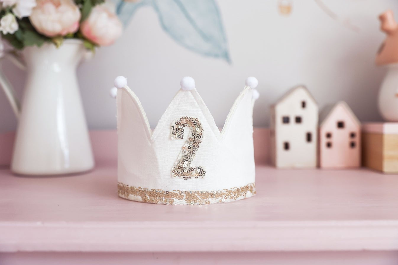 A 2nd birthday ivory linen and gold adjustable crown for your precious little one to celebrate.