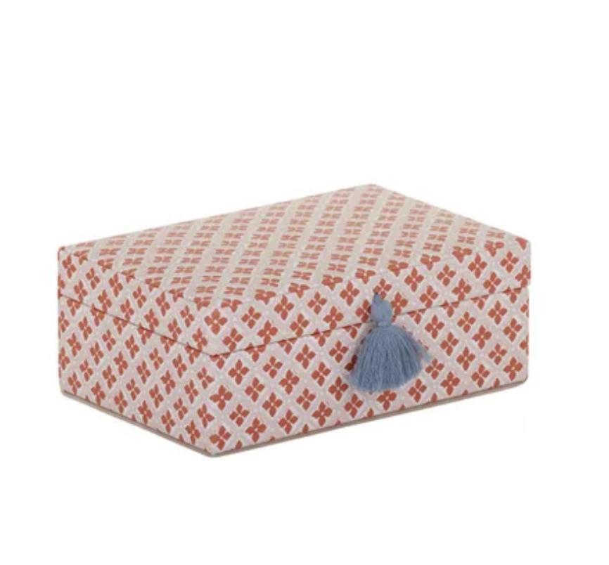 The Stella Jewellery Box in pink and red is a bold little piece for keeping treasures safe. With its patterned exterior and playful tassel, it brings colour and personality to storage while keeping jewellery and keepsakes neatly tucked away.