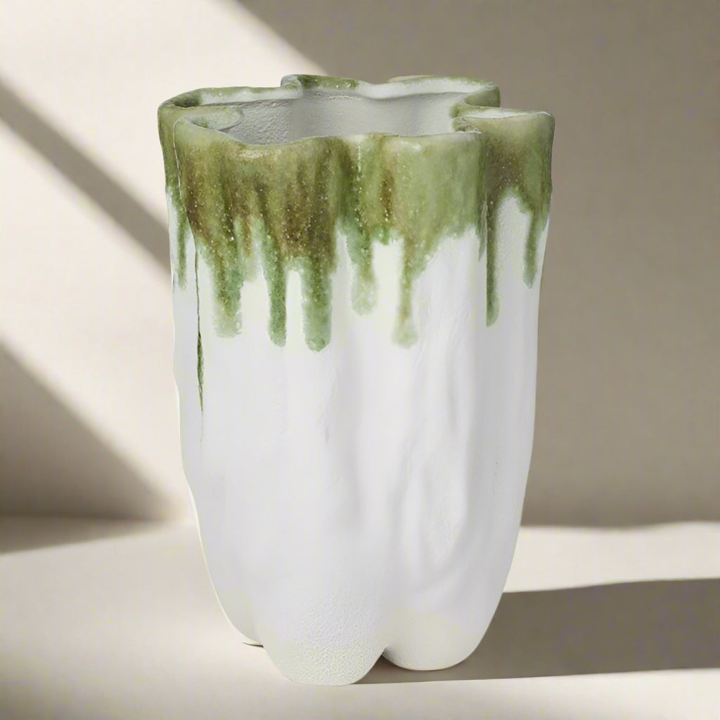 The Ferne Ceramic Vase makes a statement with its organic form and striking glaze. The textured white base is finished with a flowing green drip detail, giving it a raw yet refined presence. Perfect styled on its own or with fresh or dried stems, it adds depth and artistry to any space.