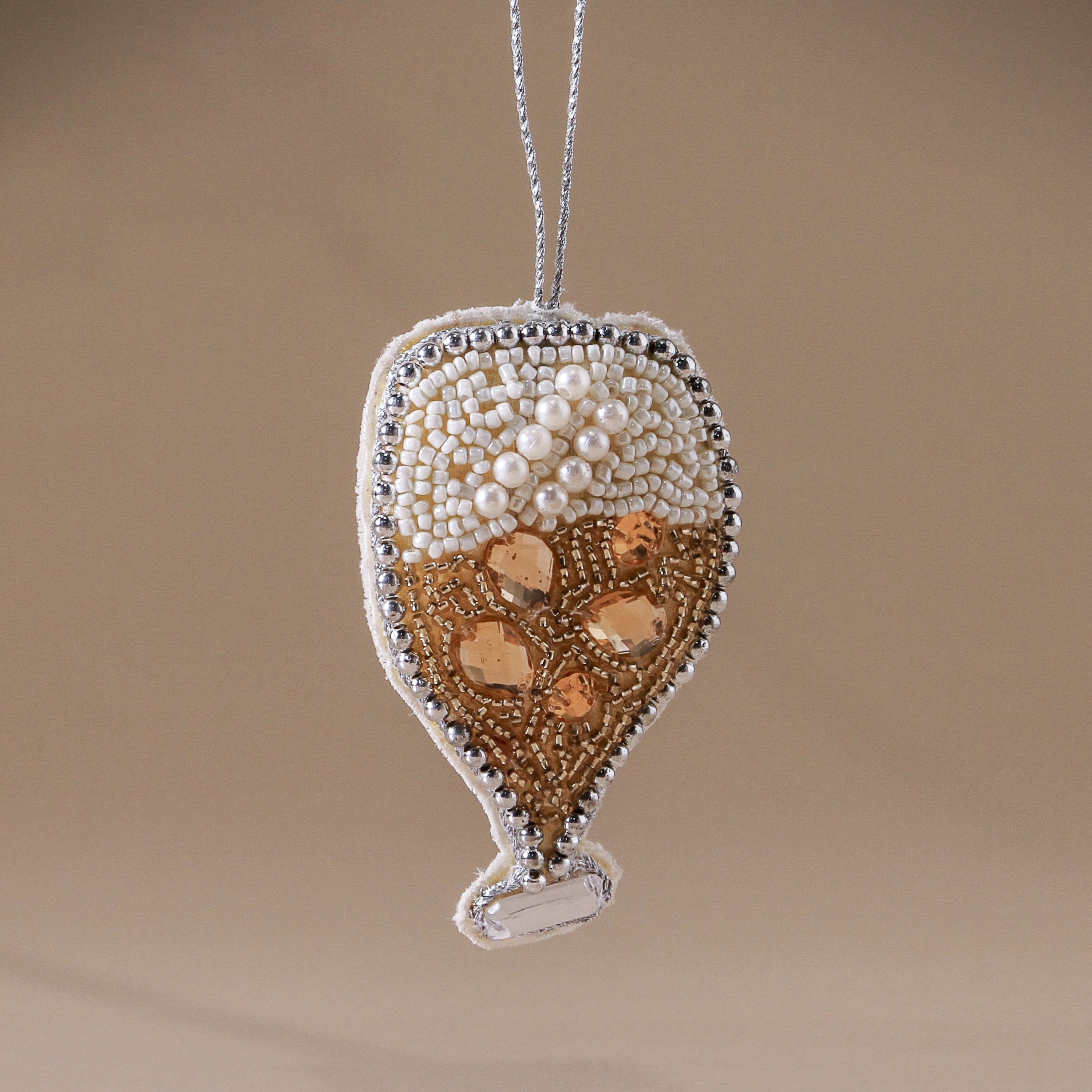 Raise a toast to the season with this shimmering golden ornament inspired by champagne bubbles. Hand-beaded pearls and metallics dance in a fluted design that catches light beautifully. A sparkling celebration of joy, perfect for those who love a little festive fizz.