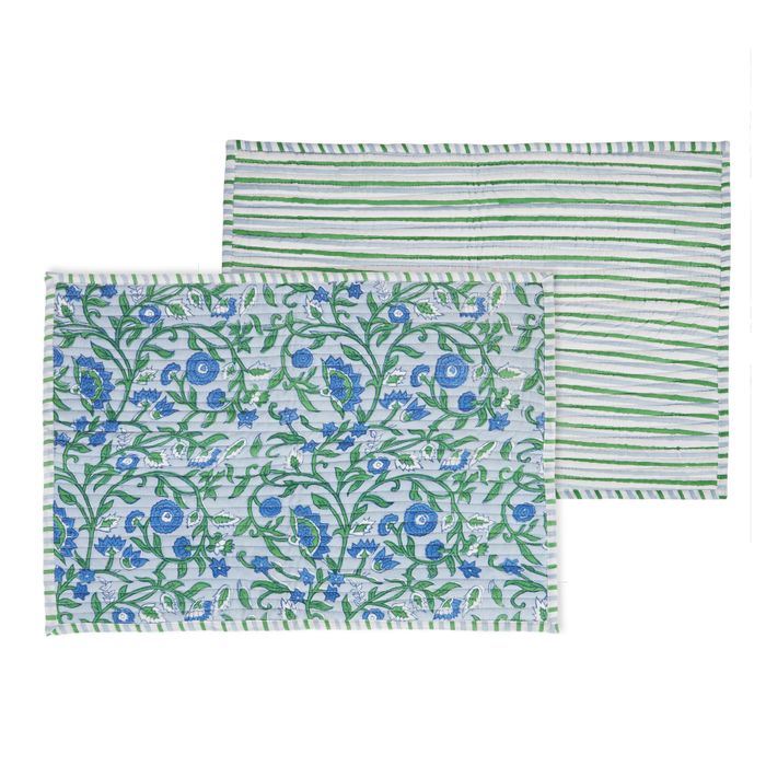 The Anika Cotton Block Placemat brings colour and craft to your table. Hand block-printed with floral and striped patterns in fresh blue and green tones, it’s perfect for everyday dining or layering into a vibrant tablescape.