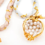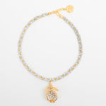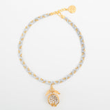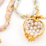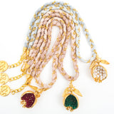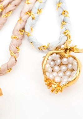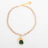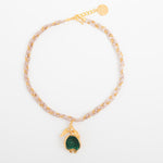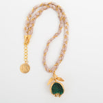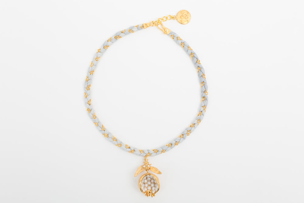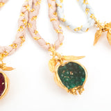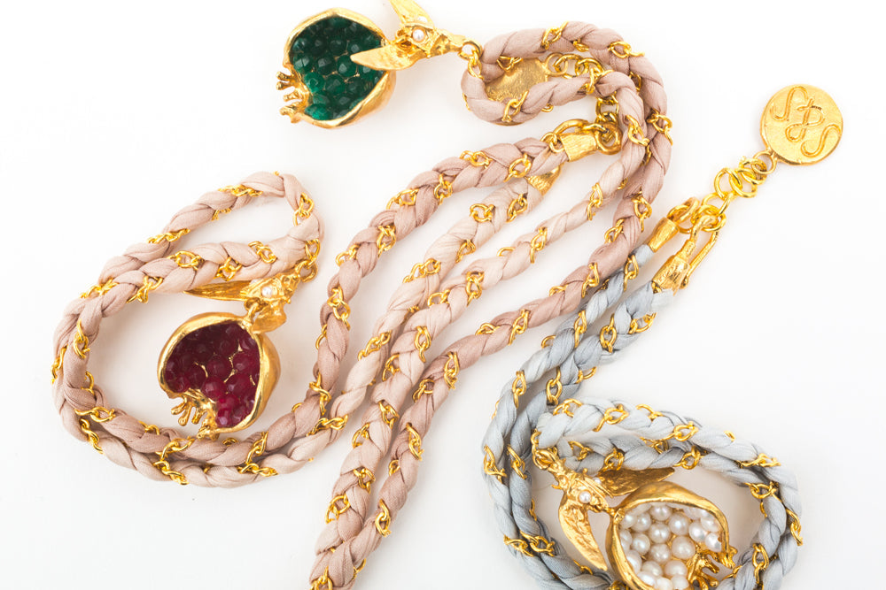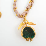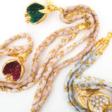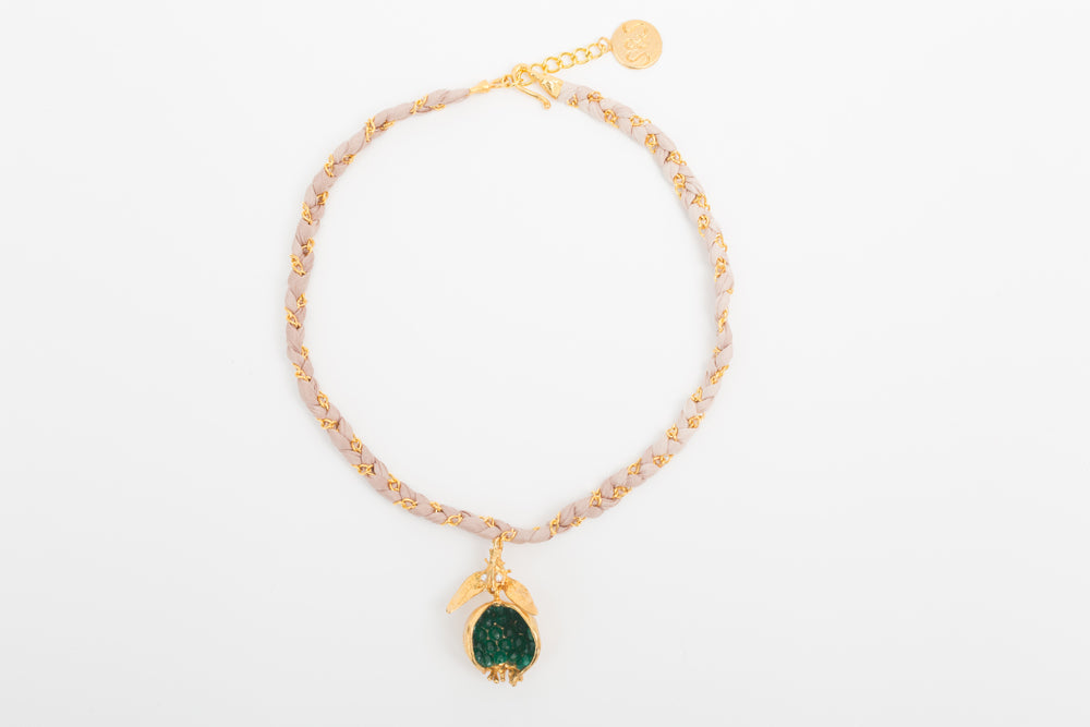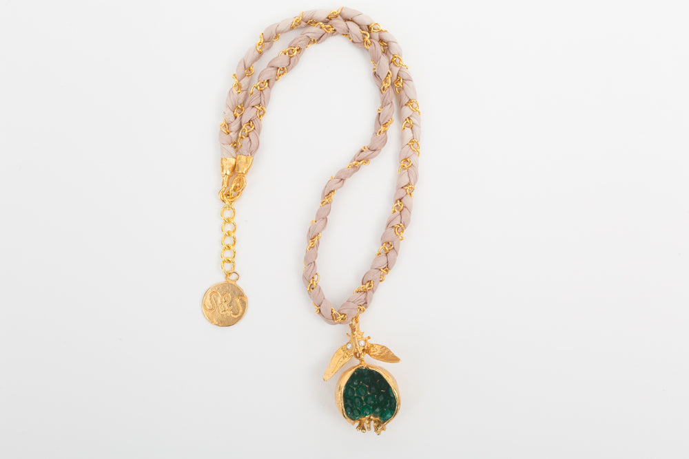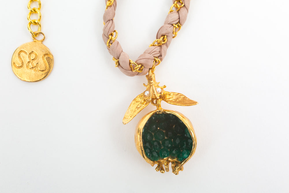 Indulge in the luxurious elegance of our Short Pomegranate Silk Necklace adorned with natural stones. The pendant features a stunning pomegranate design, perfect for adding a touch of sophistication to any outfit.
