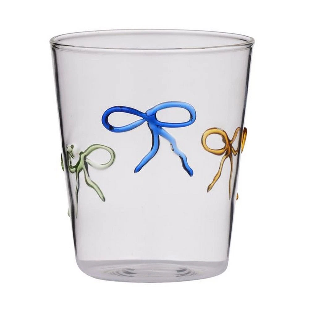 The Bow Glass Tumbler is charming and playful, featuring colourful bow motifs wrapped around clear glass. Perfect for serving water, juice, or cocktails, it adds a whimsical touch to everyday dining and entertaining.