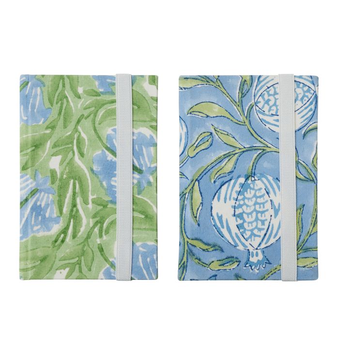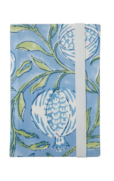 A block printed notebook with a soft patterned cover in cool blue and green tones. Light, practical and easy to carry for notes and everyday use.
